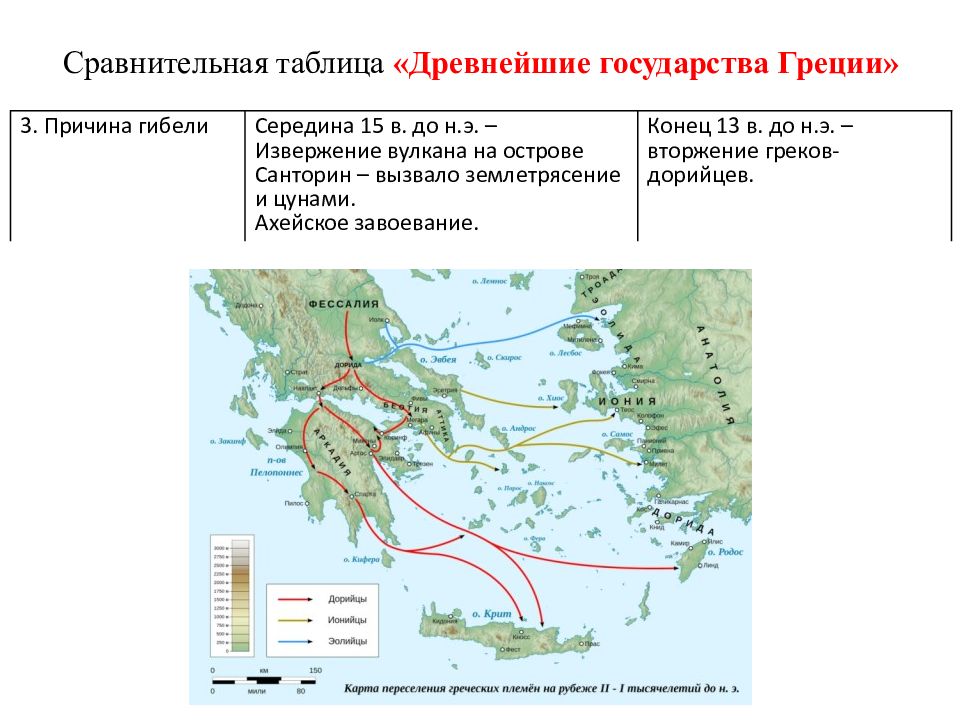 3. Причина гибели Середина 15 в. до н.э. – Извержение вулкана на острове Санторин – вызвало землетрясение и цунами. Ахейское завоевание. Конец 13 в. до н.э. – вторжение греков-дорийцев. Сравнительная таблица «Древнейшие государства Греции»