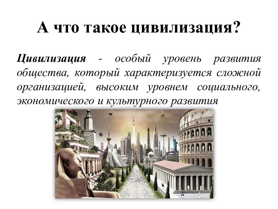 Цивилизация - особый уровень развития общества, который характеризуется сложной организацией, высоким уровнем социального, экономического и культурного развития