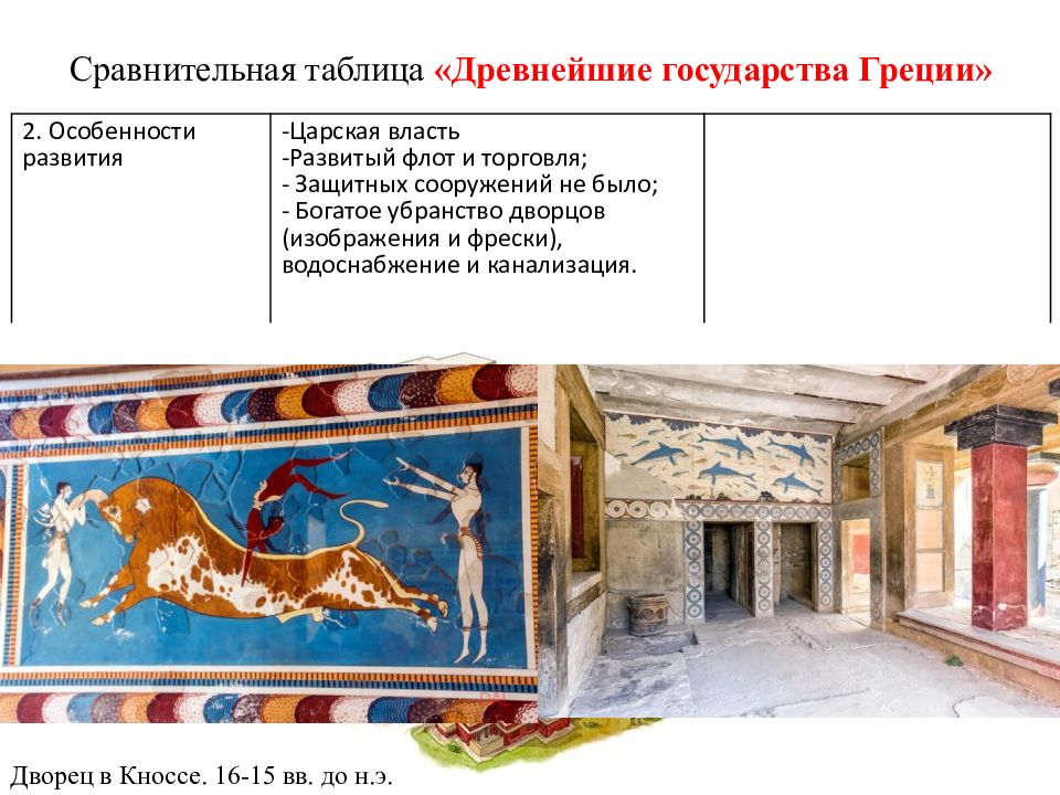 2. Особенности развития -Царская власть -Развитый флот и торговля; - Защитных сооружений не было; - Богатое убранство дворцов (изображения и фрески), водоснабжение и канализация. Сравнительная таблица «Древнейшие государства Греции» Дворец в Кноссе. 16-15 вв. до н.э.