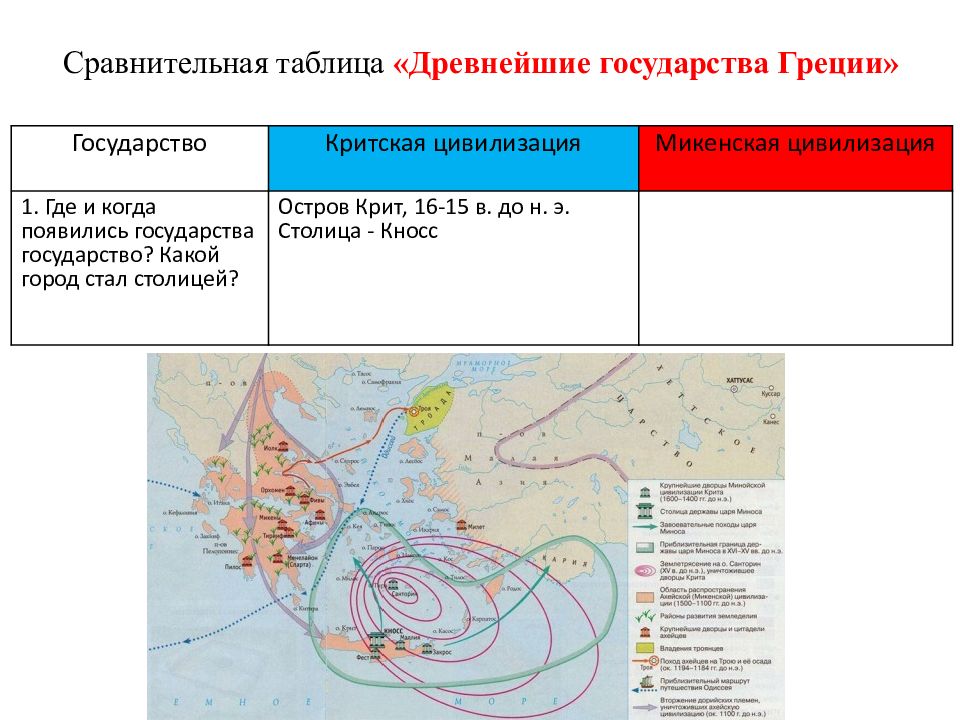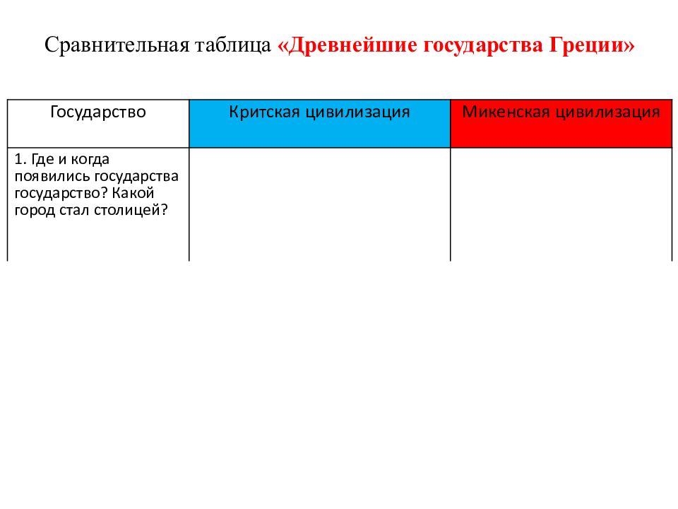 Сравнительная таблица «Древнейшие государства Греции» Государство Критская цивилизация Микенская цивилизация 1. Где и когда появились государства государство? Какой город стал столицей?