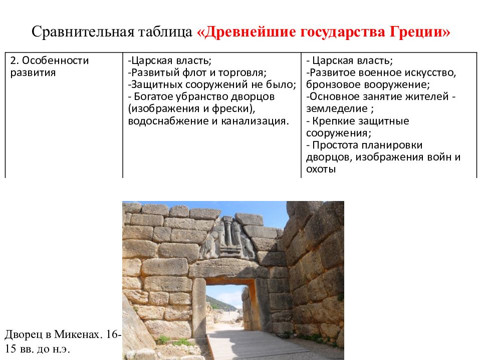 2. Особенности развития -Царская власть; -Развитый флот и торговля; -Защитных сооружений не было; - Богатое убранство дворцов (изображения и фрески), водоснабжение и канализация. - Царская власть; -Развитое военное искусство, бронзовое вооружение; -Основное занятие жителей - земледелие ; - Крепкие защитные сооружения; - Простота планировки дворцов, изображения войн и охоты Сравнительная таблица «Древнейшие государства Греции» Дворец в Микенах. 16-15 вв. до н.э.