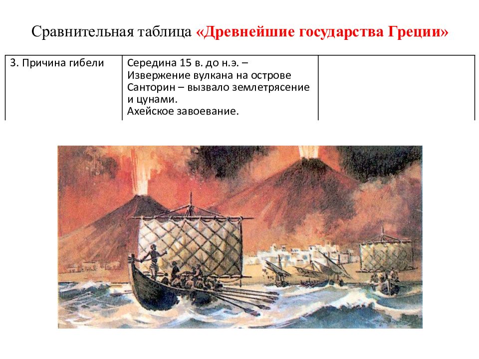 3. Причина гибели Середина 15 в. до н.э. – Извержение вулкана на острове Санторин – вызвало землетрясение и цунами. Ахейское завоевание. Сравнительная таблица «Древнейшие государства Греции»