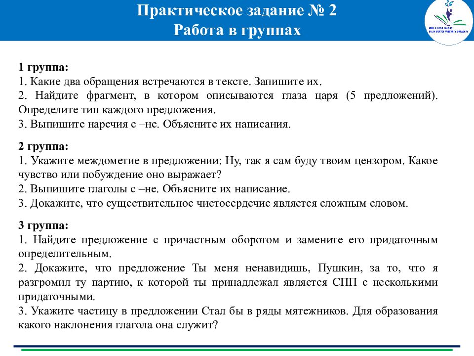 Практическое задание № 2 Работа в группах 1 группа: 1. Какие два обращения встречаются в тексте. Запишите их. 2. Найдите фрагмент, в котором описываются глаза царя (5 предложений). Определите тип каждого предложения. 3. Выпишите наречия с –не. Объясните их написания. 2 группа: 1. Укажите междометие в предложении: Ну, так я сам буду твоим цензором. Какое чувство или побуждение оно выражает? 2. Выпишите глаголы с –не. Объясните их написание. 3. Докажите, что существительное чистосердечие является сложным словом. 3 группа: 1. Найдите предложение с причастным оборотом и замените его придаточным определительным. 2. Докажите, что предложение Ты меня ненавидишь, Пушкин, за то, что я разгромил ту партию, к которой ты принадлежал является СПП с несколькими придаточными. 3. Укажите частицу в предложении Стал бы в ряды мятежников. Для образования какого наклонения глагола она служит?