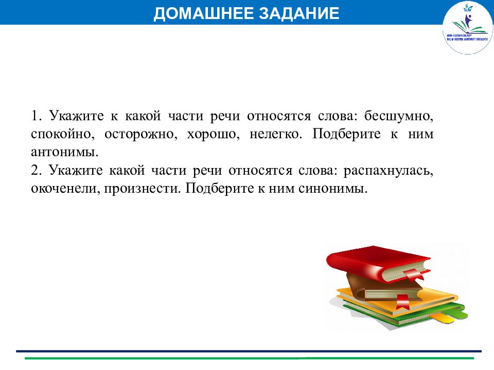 Домашнее задание 1. Укажите к какой части речи относятся слова: бесшумно, спокойно, осторожно, хорошо, нелегко. Подберите к ним антонимы. 2. Укажите какой части речи относятся слова: распахнулась, окоченели, произнести. Подберите к ним синонимы. ДОМАШНЕЕ ЗАДАНИЕ