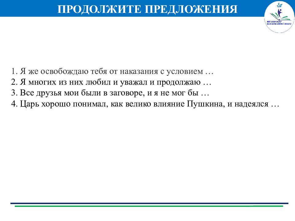 ПРОДОЛЖИТЕ ПРЕДЛОЖЕНИЯ 1. Я же освобождаю тебя от наказания с условием … 2. Я многих из них любил и уважал и продолжаю … 3. Все друзья мои были в заговоре, и я не мог бы … 4. Царь хорошо понимал, как велико влияние Пушкина, и надеялся …
