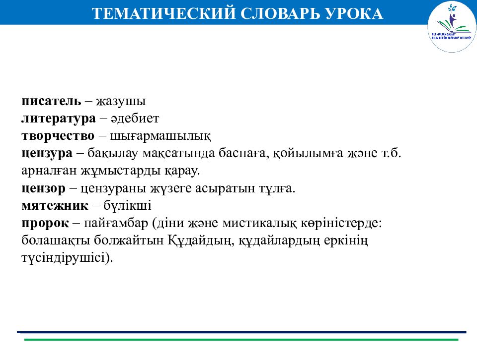 ТЕМАТИЧЕСКИЙ СЛОВАРЬ УРОКА писатель – жазушы литература – әдебиет творчество – шығармашылық цензура – бақылау мақсатында баспаға, қойылымға және т.б. арналған жұмыстарды қарау. цензор – цензураны жүзеге асыратын тұлға. мятежник – бүлікші пророк – пайғамбар (діни және мистикалық көріністерде: болашақты болжайтын Құдайдың, құдайлардың еркінің түсіндірушісі).