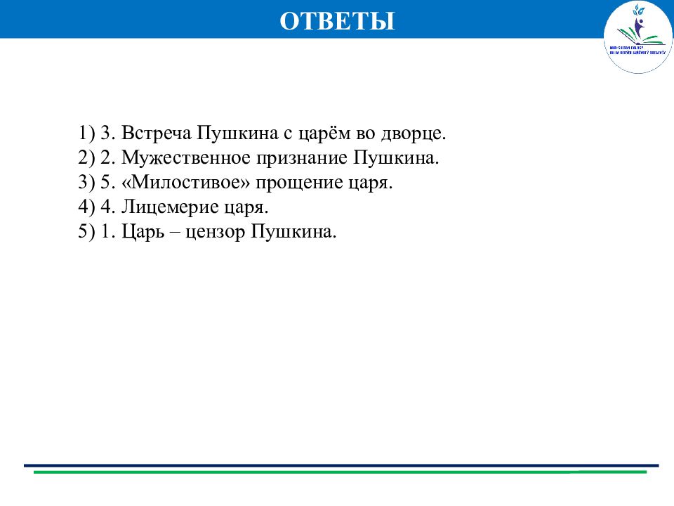 1) 3. Встреча Пушкина с царём во дворце. 2) 2. Мужественное признание Пушкина. 3) 5. «Милостивое» прощение царя. 4) 4. Лицемерие царя. 5) 1. Царь – цензор Пушкина. ОТВЕТЫ