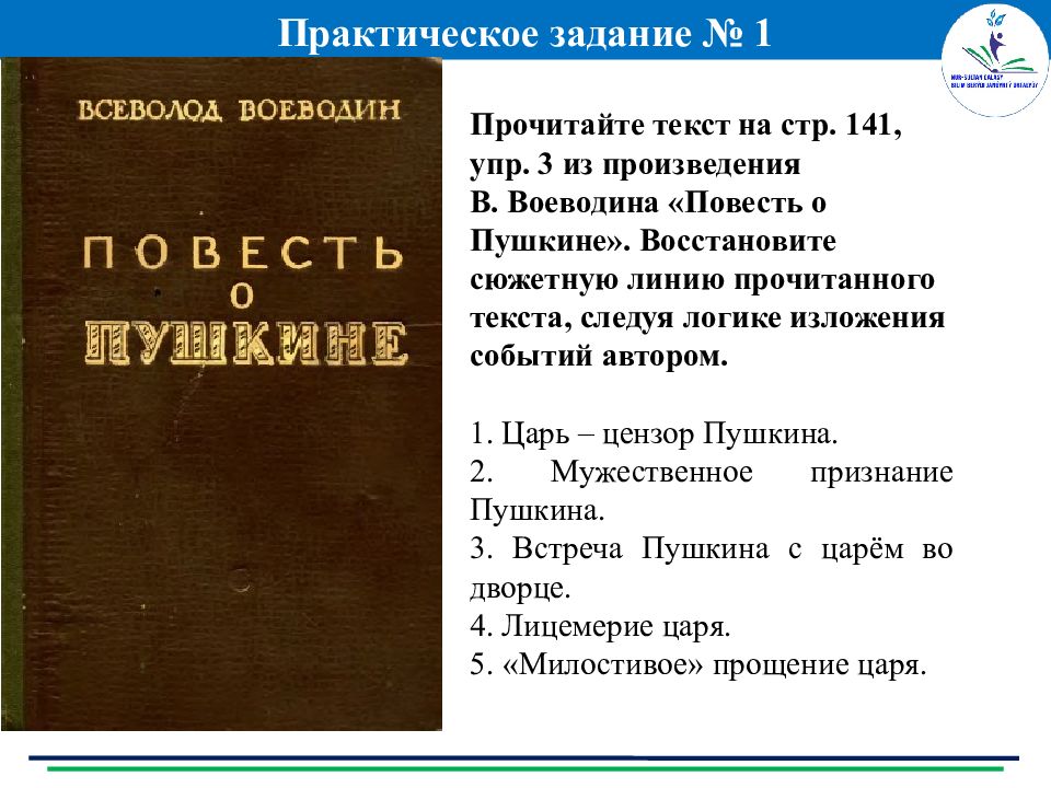 Прочитайте текст на стр. 141, упр. 3 из произведения В. Воеводина «Повесть о Пушкине». Восстановите сюжетную линию прочитанного текста, следуя логике изложения событий автором. 1. Царь – цензор Пушкина. 2. Мужественное признание Пушкина. 3. Встреча Пушкина с царём во дворце. 4. Лицемерие царя. 5. «Милостивое» прощение царя. Практическое задание № 1