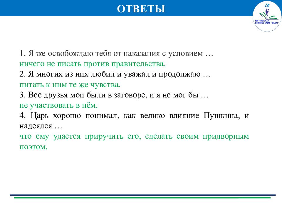 1. Я же освобождаю тебя от наказания с условием … ничего не писать против правительства. 2. Я многих из них любил и уважал и продолжаю … питать к ним те же чувства. 3. Все друзья мои были в заговоре, и я не мог бы … не участвовать в нём. 4. Царь хорошо понимал, как велико влияние Пушкина, и надеялся … что ему удастся приручить его, сделать своим придворным поэтом. ОТВЕТЫ