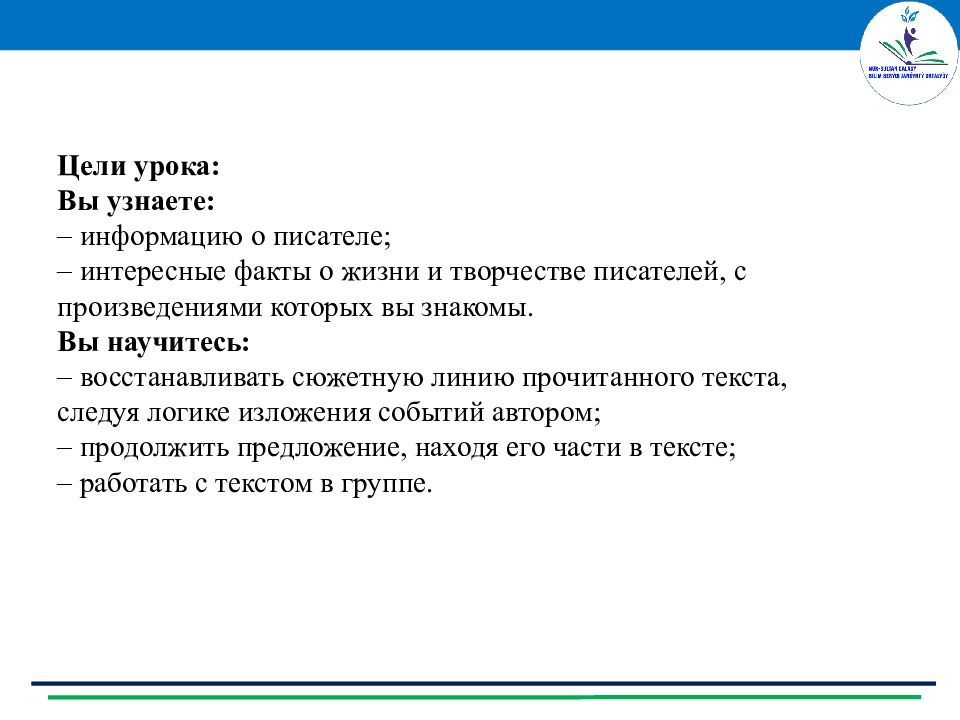 Цели урока: Вы узнаете: – информацию о писателе; – интересные факты о жизни и творчестве писателей, с произведениями которых вы знакомы. Вы научитесь: – восстанавливать сюжетную линию прочитанного текста, следуя логике изложения событий автором ; – продолжить предложение, находя его части в тексте; – работать с текстом в группе.