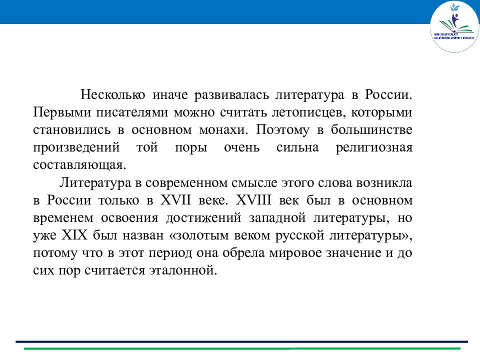 Несколько иначе развивалась литература в России. Первыми писателями можно считать летописцев, которыми становились в основном монахи. Поэтому в большинстве произведений той поры очень сильна религиозная составляющая. Литература в современном смысле этого слова возникла в России только в XVII веке. XVIII век был в основном временем освоения достижений западной литературы, но уже XIX был назван «золотым веком русской литературы», потому что в этот период она обрела мировое значение и до сих пор считается эталонной.
