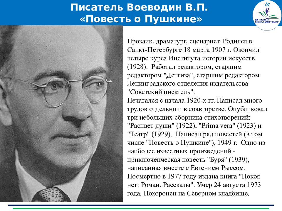 Писатель Воеводин В.П. «Повесть о Пушкине» Прозаик, драматург, сценарист. Родился в Санкт-Петербурге 18 марта 1907 г. Окончил четыре курса Института истории искусств (1928). Работал редактором, старшим редактором "Детгиза", старшим редактором Ленинградского отделения издательства "Советский писатель". Печатался с начала 1920-х гг. Написал много трудов отдельно и в соавторстве. Опубликовал три небольших сборника стихотворений: "Расцвет души" (1922), "Prima vera" (1923) и "Театр" (1929). Написал ряд повестей (в том числе "Повесть о Пушкине"), 1949 г. Одно из наиболее известных произведений - приключенческая повесть "Буря" ( 1939), написанная вместе с Евгением Рыссом. Посмертно в 1977 году издана книга "Покоя нет: Роман. Рассказы". Умер 24 августа 1973 года. Похоронен на Северном кладбище.