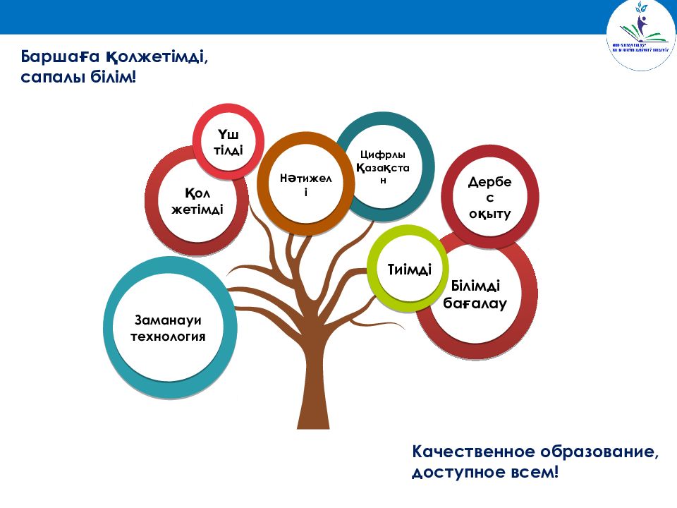 Заманауи технология Білімді бағалау Қол жетімді Цифрлы Қ аза қ стан Дербес оқыту Н ә тижелі Тиімді Үш тілді Барша ғ а қ олжетімді, сапалы білім ! Качественное образование, доступное всем!