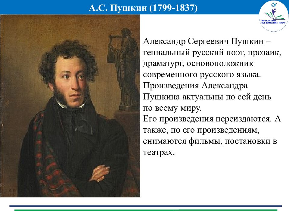А.С. Пушкин (1799-1837) Александр Сергеевич Пушкин – гениальный русский поэт, прозаик, драматург, основоположник современного русского языка. Произведения Александра Пушкина актуальны по сей день по всему миру. Его произведения переиздаются. А также, по его произведениям, снимаются фильмы, постановки в театрах.
