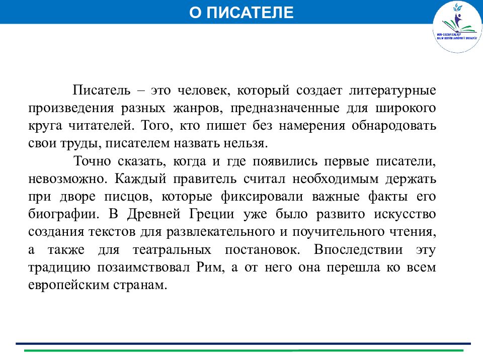 Писатель – это человек, который создает литературные произведения разных жанров, предназначенные для широкого круга читателей. Того, кто пишет без намерения обнародовать свои труды, писателем назвать нельзя. Точно сказать, когда и где появились первые писатели, невозможно. Каждый правитель считал необходимым держать при дворе писцов, которые фиксировали важные факты его биографии. В Древней Греции уже было развито искусство создания текстов для развлекательного и поучительного чтения, а также для театральных постановок. Впоследствии эту традицию позаимствовал Рим, а от него она перешла ко всем европейским странам. О ПИСАТЕЛЕ
