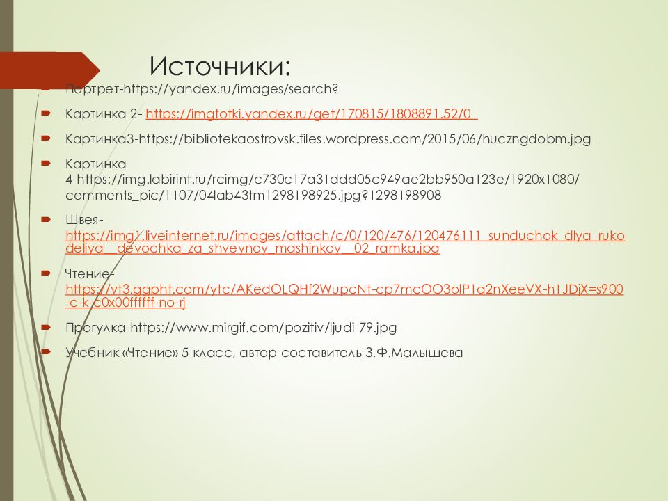 Портрет- https://yandex.ru/images/search? Картинка 2- https://imgfotki.yandex.ru/get/170815/1808891.52/0_ Картинка3- https://bibliotekaostrovsk.files.wordpress.com/2015/06/huczngdobm.jpg Картинка 4- https://img.labirint.ru/rcimg/c730c17a31ddd05c949ae2bb950a123e/1920x1080/comments_pic/1107/04lab43tm1298198925.jpg?1298198908 Швея- https://img1.liveinternet.ru/images/attach/c/0/120/476/120476111_sunduchok_dlya_rukodeliya__devochka_za_shveynoy_mashinkoy__02_ramka.jpg Чтение- https://yt3.ggpht.com/ytc/AKedOLQHf2WupcNt-cp7mcOO3olP1a2nXeeVX-h1JDjX=s900-c-k-c0x00ffffff-no-rj Прогулка- https://www.mirgif.com/pozitiv/ljudi-79.jpg Учебник «Чтение» 5 класс, автор-составитель З.Ф.Малышева