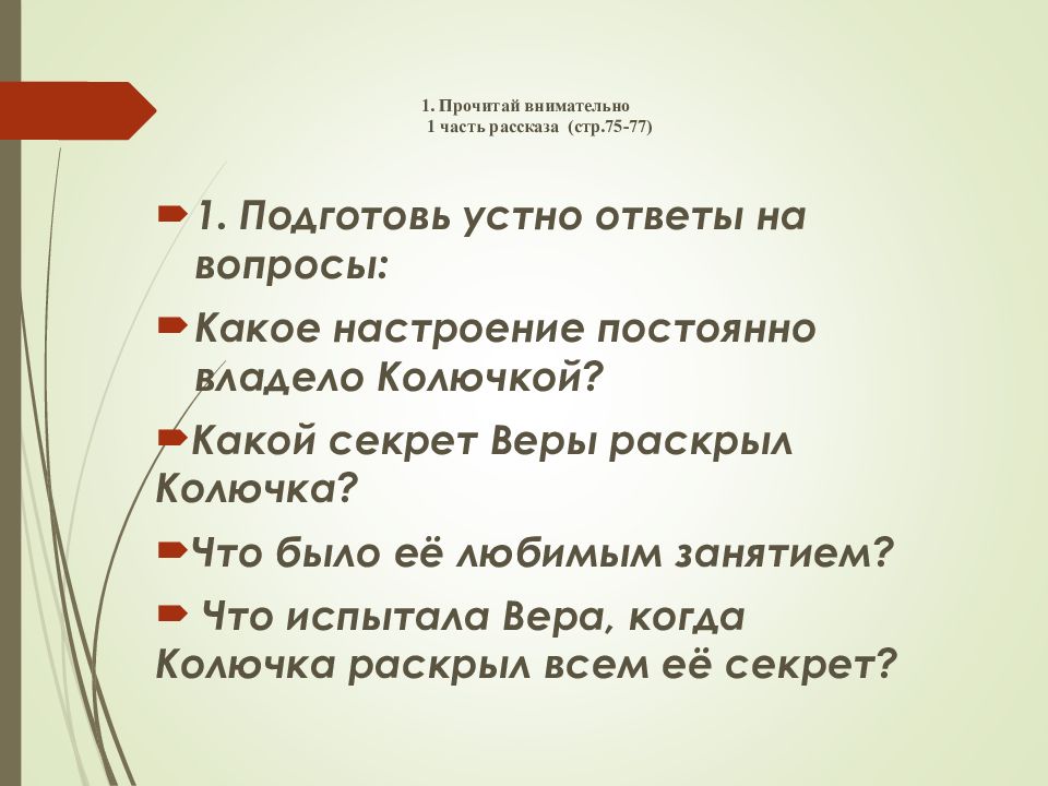 1. Подготовь устно ответы на вопросы: Какое настроение постоянно владело Колючкой ? Какой секрет Веры раскрыл Колючка? Что было её любимым занятием? Что испытала Вера, когда Колючка раскрыл всем её секрет ?