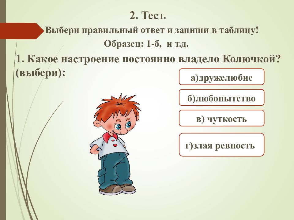 а)дружелюбие г)злая ревность б)любопытство 2. Тест. Выбери правильный ответ и запиши в таблицу! Образец: 1-б, и т.д. 1. Какое настроение постоянно владело Колючкой? (выбери): в) чуткость