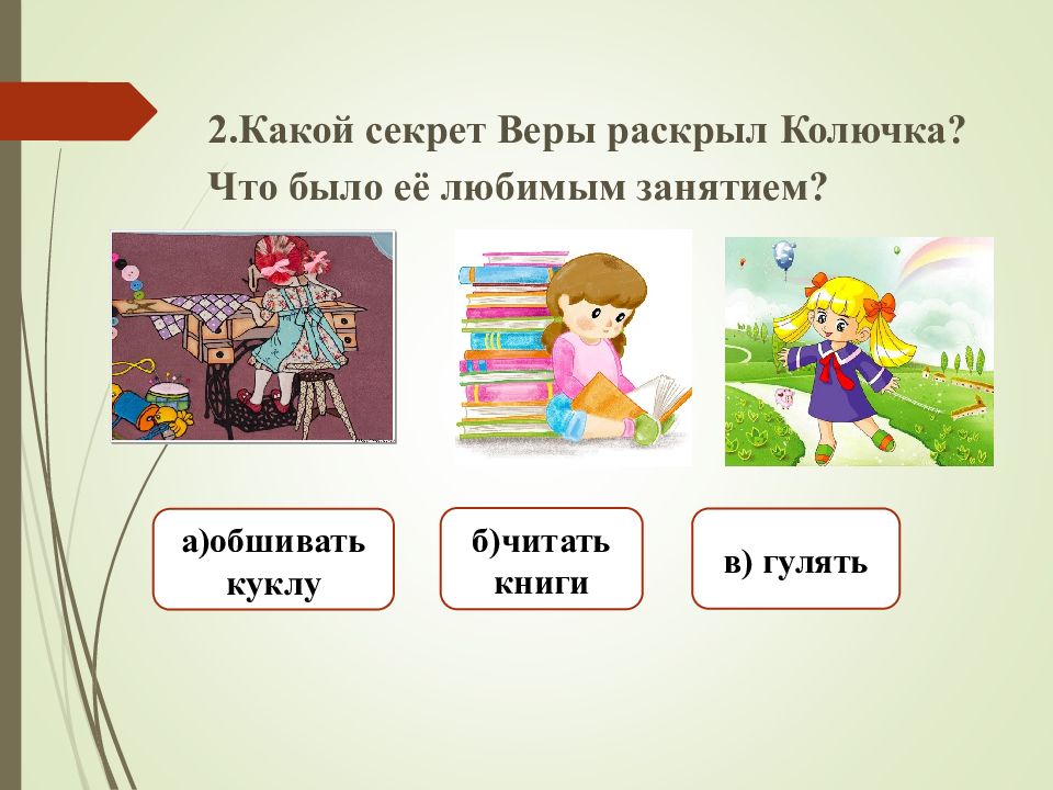 а)обшивать куклу б)читать книги в) гулять 2.Какой секрет Веры раскрыл Колючка? Что было её любимым занятием?