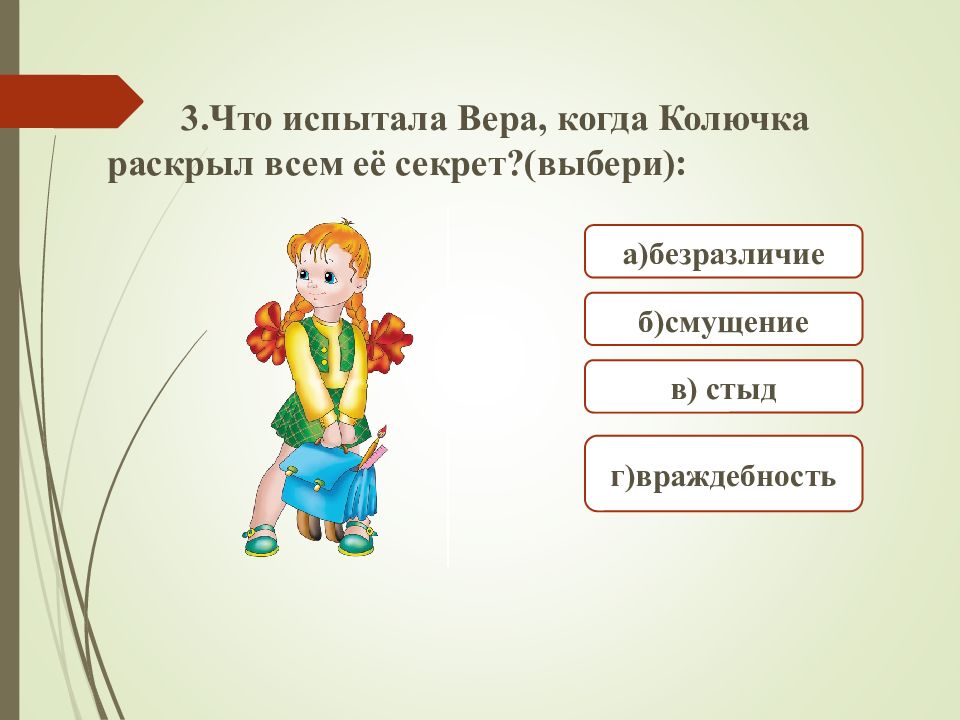 а)безразличие г)враждебность б)смущение 3.Что испытала Вера, когда Колючка раскрыл всем её секрет?(выбери): в) стыд