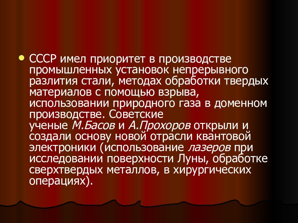 СССР имел приоритет в производстве промышленных установок непрерывного разлития стали, методах обработки твердых материалов с помощью взрыва, использовании природного газа в доменном производстве. Советские ученые М.Басов и А.Прохоров открыли и создали основу новой отрасли квантовой электроники (использование лазеров при исследовании поверхности Луны, обработке сверхтвердых металлов, в хирургических операциях).