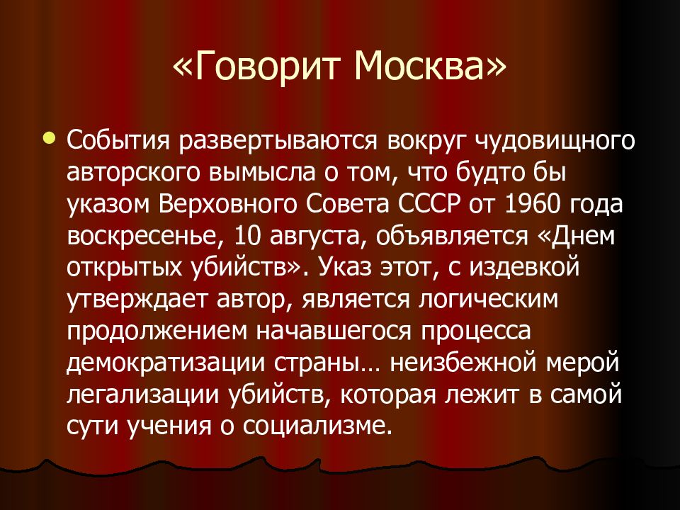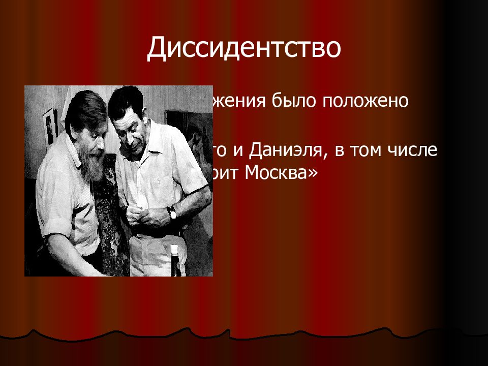 Начало такого движения было положено процессом Писателей Синявского и Даниэля, в том числе за их роман «Говорит Москва»