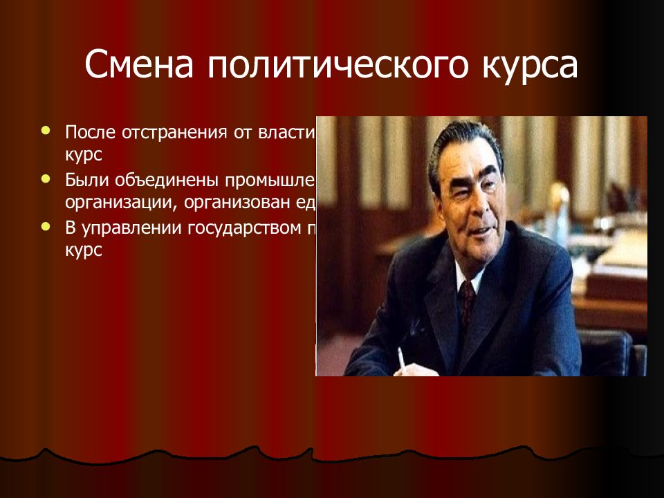 После отстранения от власти Хрущёва сменился и политический курс Были объединены промышленные и сельские партийные организации, организован единый Госплан СССР В управлении государством победил умеренно-консервативный курс