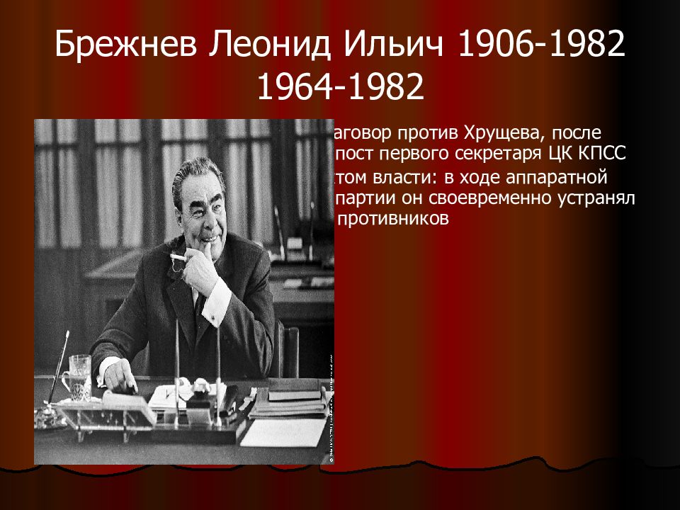 В 1964 Брежнев возглавляет заговор против Хрущева, после смещения, которого занимает пост первого секретаря ЦК КПСС Брежнев был наделен инстинктом власти: в ходе аппаратной борьбы за власть и влияние в партии он своевременно устранял своих явных и потенциальных противников