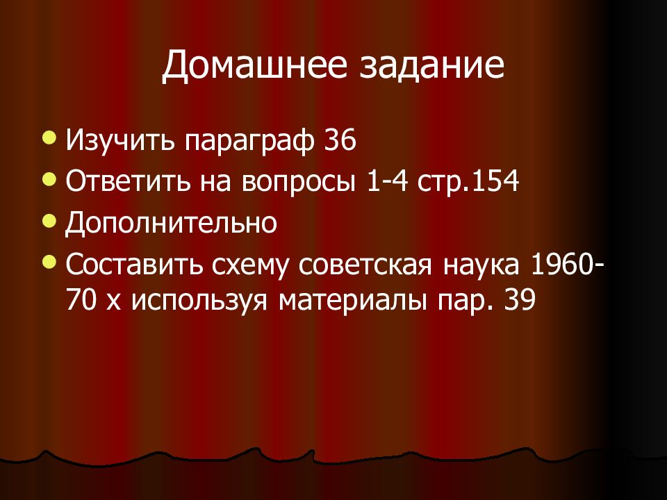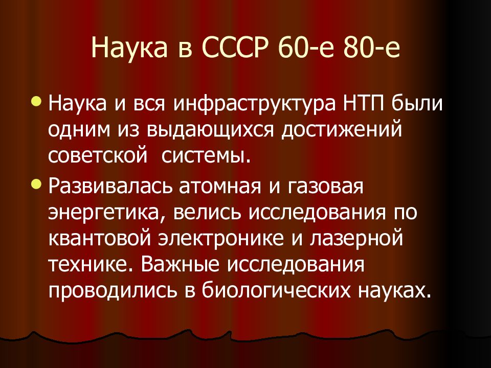 Наука и вся инфраструктура НТП были одним из выдающихся достижений советской системы. Развивалась атомная и газовая энергетика, велись исследования по квантовой электронике и лазерной технике. Важные исследования проводились в биологических науках.