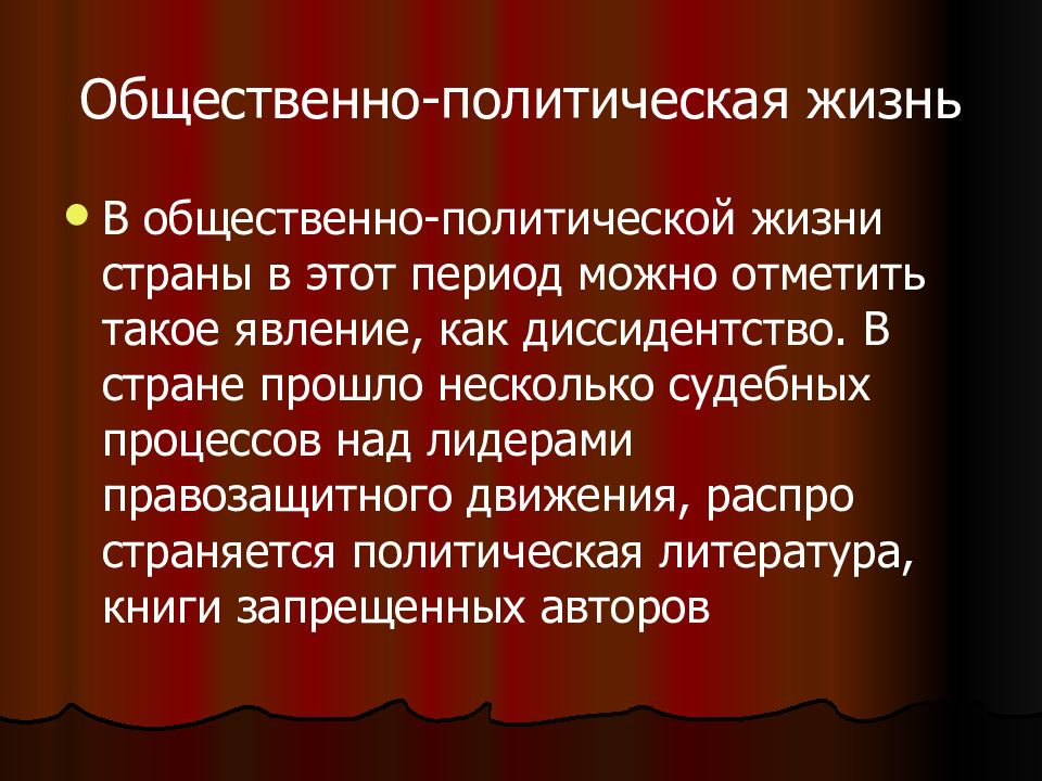 В общественно-политической жизни страны в этот период можно отметить такое явление, как диссидентство. В стране прошло несколько судебных процессов над лидерами правозащитного движения, распро страняется политическая литература, книги запрещенных авторов