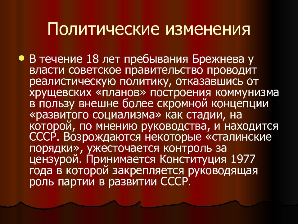 В течение 18 лет пребывания Брежнева у власти советское правительство проводит реалистическую политику, отказавшись от хрущевских «планов» построения коммунизма в пользу внешне более скромной концепции «развитого социализма» как стадии, на которой, по мнению руководства, и находится СССР. Возрождаются некоторые «сталинские порядки», ужесточается контроль за цензурой. Принимается Конституция 1977 года в которой закрепляется руководящая роль партии в развитии СССР.