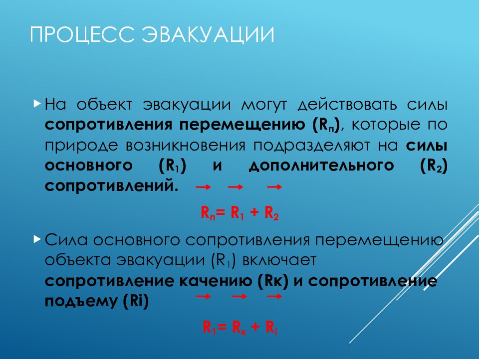 На объект эвакуации могут действовать силы сопротивления перемещению ( R п ), которые по природе возникновения подразделяют на силы основного (R 1 ) и дополнительного (R 2 ) сопротивлений. R п = R 1 + R 2 Сила основного сопротивления перемещению объекта эвакуации (R 1 ) включает сопротивление качению ( Rк ) и сопротивление подъему ( Ri ) R 1 = R к + R i