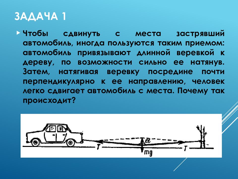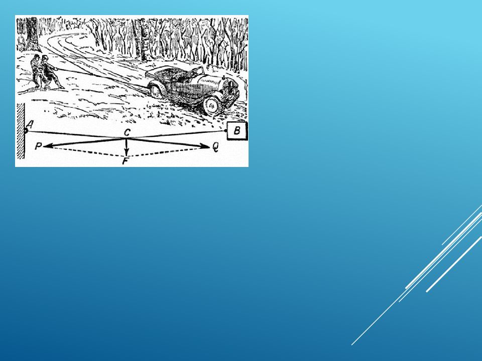 Чтобы сдвинуть с места застрявший автомобиль, иногда пользуются таким приемом: автомобиль привязывают длинной веревкой к дереву, по возможности сильно ее натянув. Затем, натягивая веревку посредине почти перпендикулярно к ее направлению, человек легко сдвигает автомобиль с места. Почему так происходит?