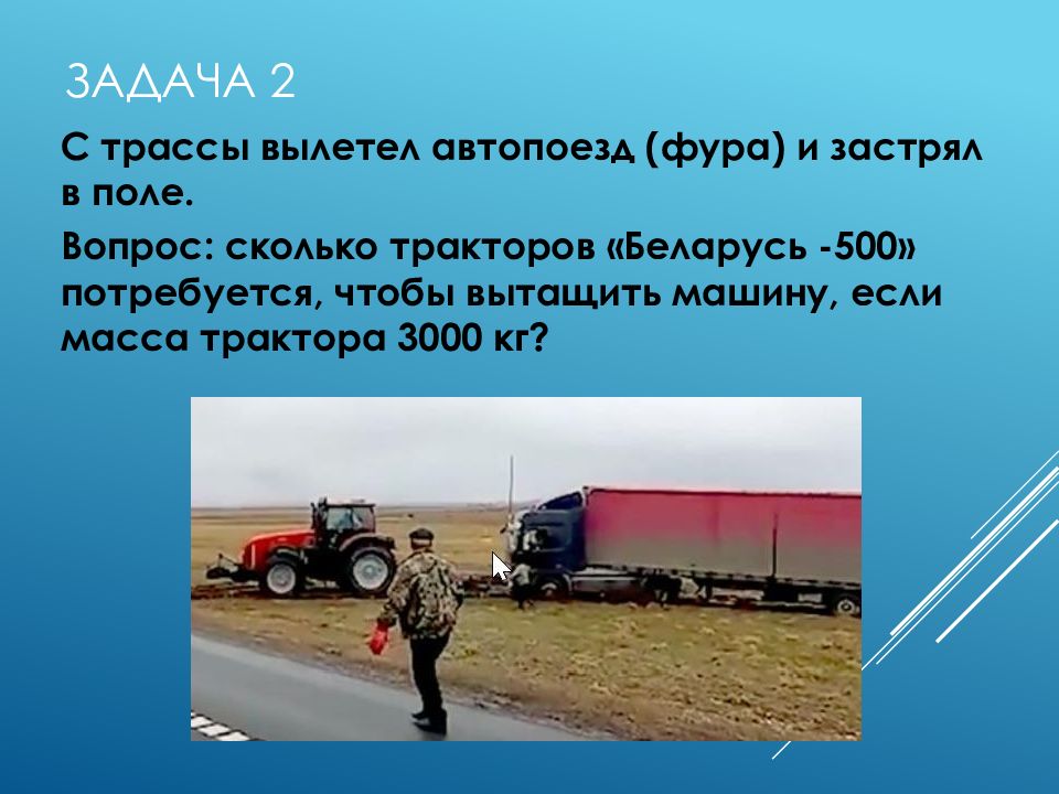 С трассы вылетел автопоезд (фура) и застрял в поле. Вопрос: сколько тракторов «Беларусь -500» потребуется, чтобы вытащить машину, если масса трактора 3000 кг?