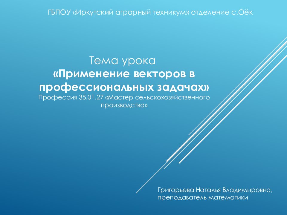 Тема урока «Применение векторов в профессиональных задачах» Профессия 35.01.27 «Мастер сельскохозяйственного производства» ГБПОУ «Иркутский аграрный техникум» отделение с.Оёк Григорьева Наталья Владимировна, преподаватель математики