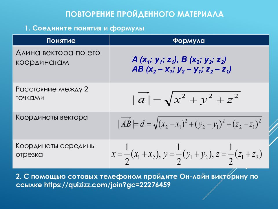 Понятие Формула Длина вектора по его координатам Расстояние между 2 точками Координаты вектора Координаты середины отрезка 2. С помощью сотовых телефоном пройдите Он-лайн викторину по ссылке https://quizizz.com/join?gc=22276459 1. Соедините понятия и формулы