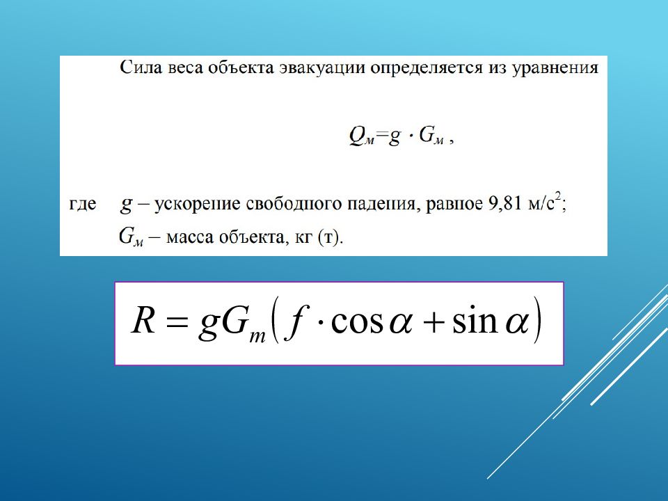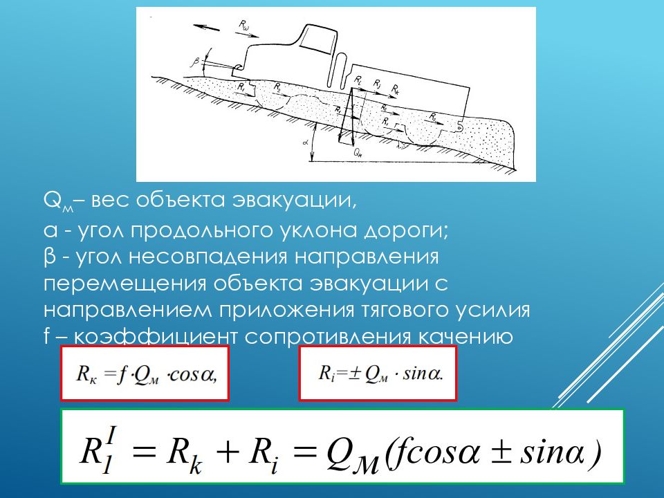 Q м – вес объекта эвакуации, α - угол продольного уклона дороги; β - угол несовпадения направления перемещения объекта эвакуации с направлением приложения тягового усилия f – коэффициент сопротивления качению