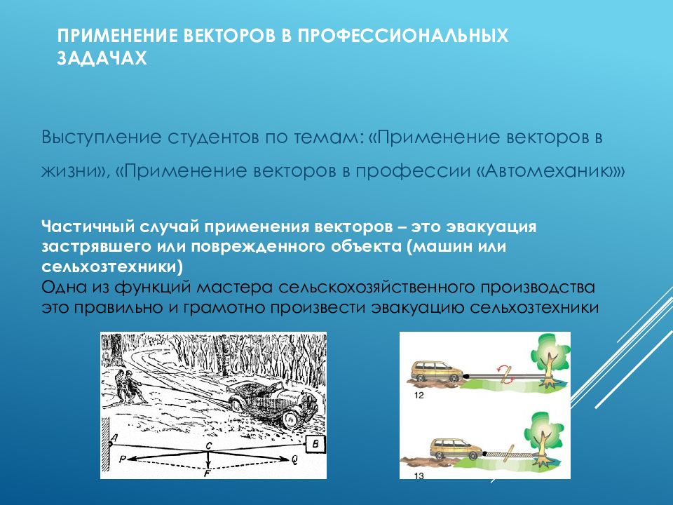 Выступление студентов по темам: «Применение векторов в жизни», «Применение векторов в профессии «Автомеханик»» Частичный случай применения векторов – это эвакуация застрявшего или поврежденного объекта (машин или сельхозтехники) Одна из функций мастера сельскохозяйственного производства это правильно и грамотно произвести эвакуацию сельхозтехники