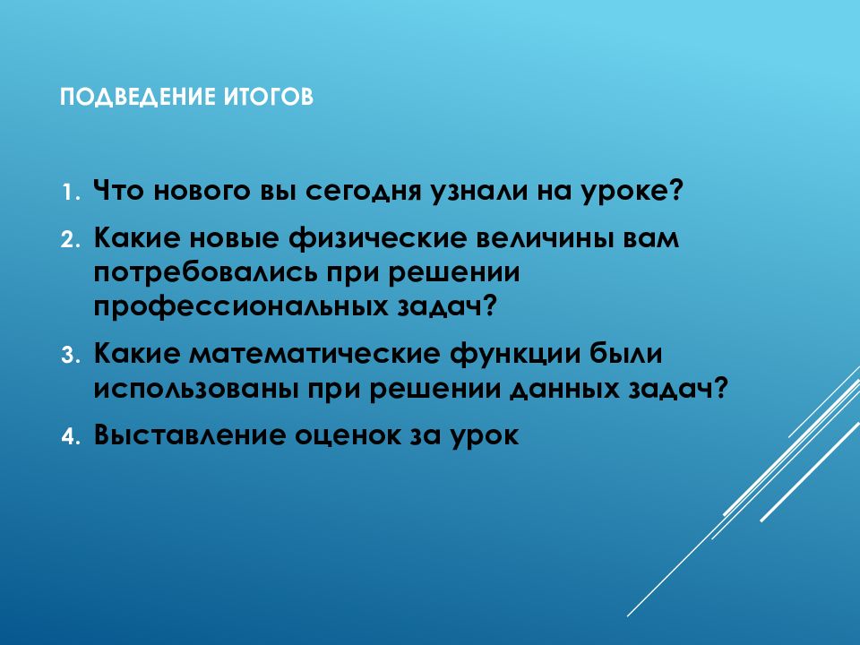 Что нового вы сегодня узнали на уроке? Какие новые физические величины вам потребовались при решении профессиональных задач? Какие математические функции были использованы при решении данных задач? Выставление оценок за урок