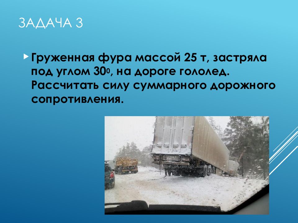 Груженная фура массой 25 т, застряла под углом 30 0, на дороге гололед. Рассчитать силу суммарного дорожного сопротивления.