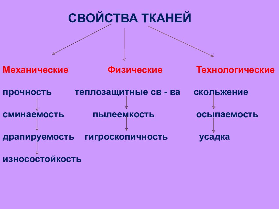 Механические Физические Технологические прочность теплозащитные св - ва скольжение сминаемость пылеемкость осыпаемость драпируемость гигроскопичность усадка износостойкость