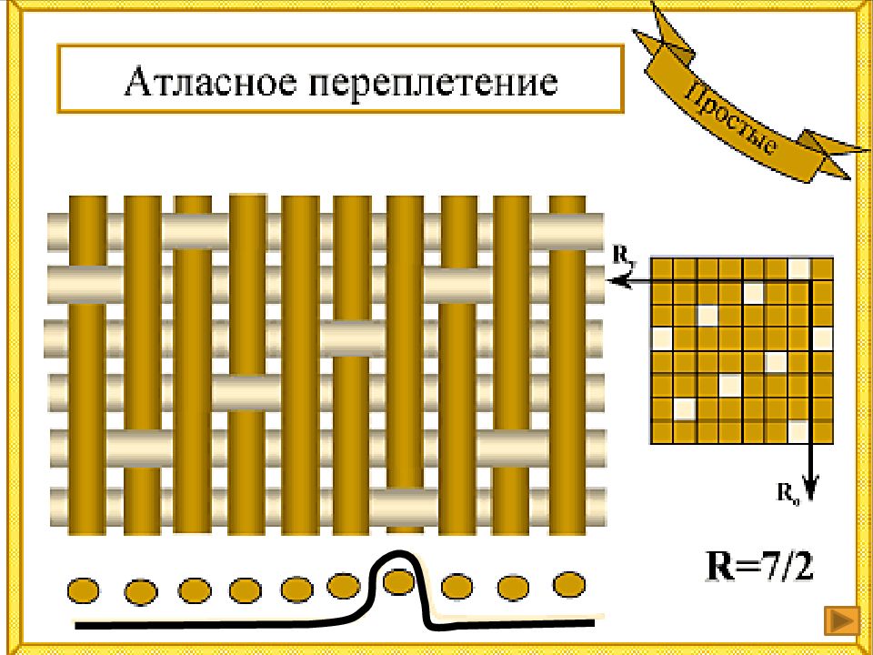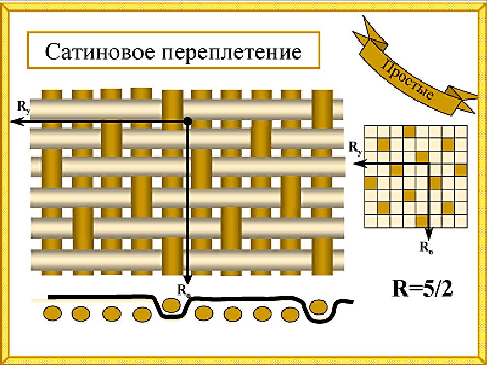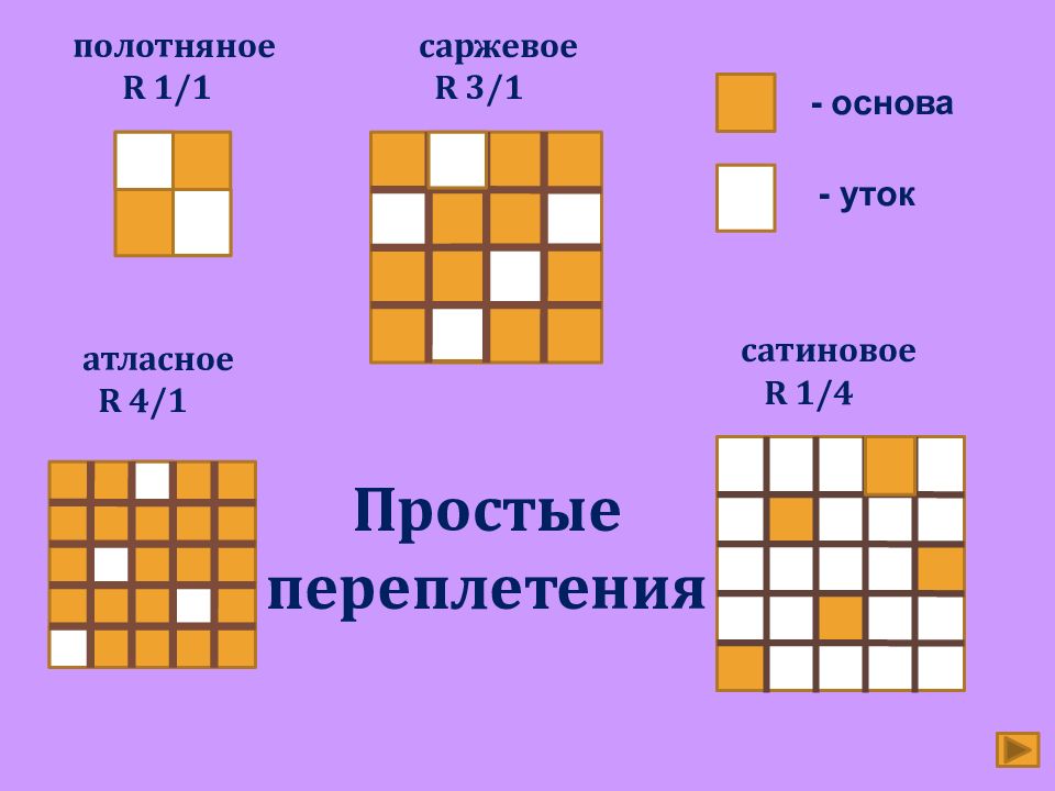 полотняное R 1/1 саржевое R 3/1 атласное R 4/1 сатиновое R 1/4 Простые переплетения - основа - уток