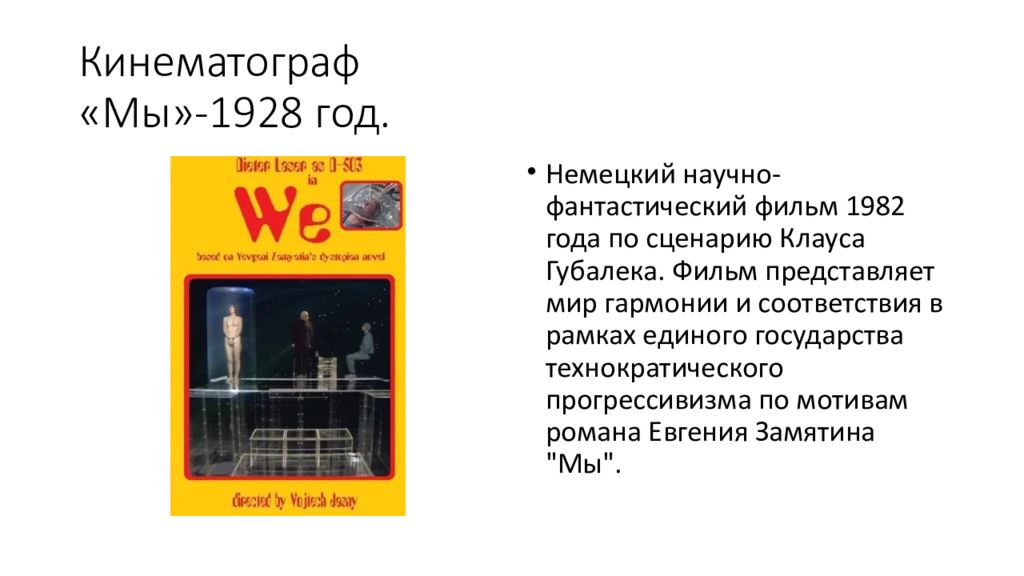 Немецкий научно-фантастический фильм 1982 года по сценарию Клауса Губалека. Фильм представляет мир гармонии и соответствия в рамках единого государства технократического прогрессивизма по мотивам романа Евгения Замятина "Мы".