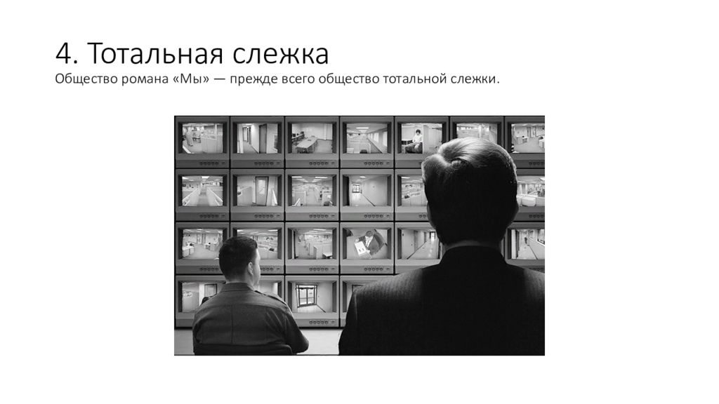 Слайд 8: 4. Тотальная слежка Общество романа «Мы» — прежде всего общество тотальной слежки