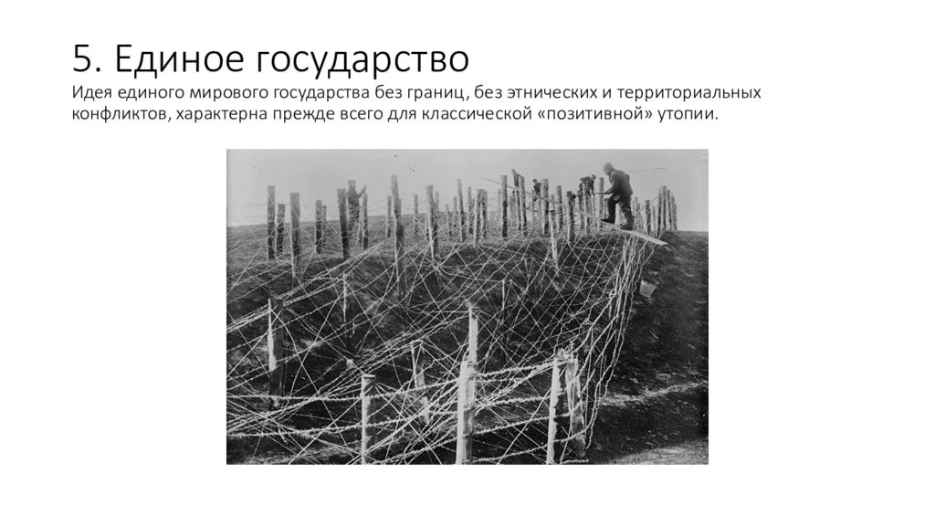 Слайд 9: 5. Единое государство Идея единого мирового государства без границ, без этнических и территориальных конфликтов, характерна прежде всего для классической «позитивной» утопии