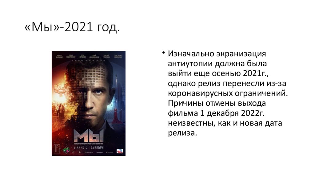 Изначально экранизация антиутопии должна была выйти еще осенью 2021г., однако релиз перенесли из-за коронавирусных ограничений. Причины отмены выхода фильма 1 декабря 2022г. неизвестны, как и новая дата релиза.