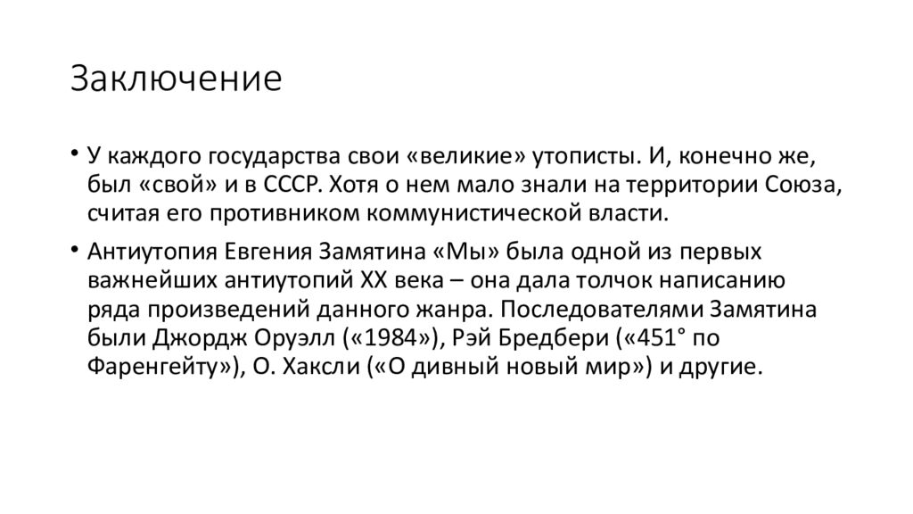 У каждого государства свои «великие» утописты. И, конечно же, был «свой» и в СССР. Хотя о нем мало знали на территории Союза, считая его противником коммунистической власти. Антиутопия Евгения Замятина «Мы» была одной из первых важнейших антиутопий ХХ века – она дала толчок написанию ряда произведений данного жанра. Последователями Замятина были Джордж Оруэлл («1984»), Рэй Бредбери («451° по Фаренгейту»), О. Хаксли («О дивный новый мир») и другие.