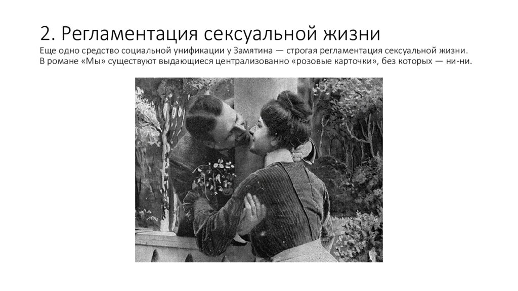 Слайд 6: 2. Регламентация сексуальной жизни Еще одно средство социальной унификации у Замятина — строгая регламентация сексуальной жизни. В романе «Мы» существуют выдающиеся централизованно «розовые карточки», без которых — ни-ни