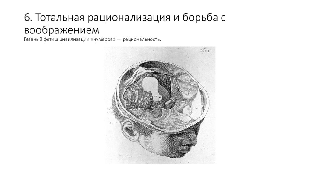 Слайд 10: 6. Тотальная рационализация и борьба с воображением Главный фетиш цивилизации « нумеров » — рациональность