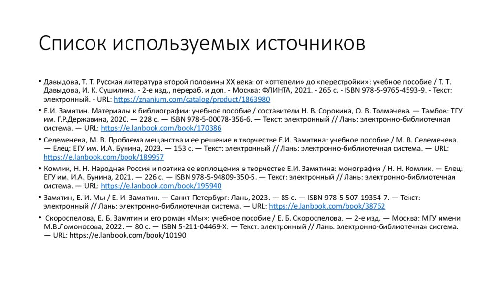 Давыдова, Т. Т. Русская литература второй половины ХХ века: от «оттепели» до «перестройки»: учебное пособие / Т. Т. Давыдова, И. К. Сушилина. - 2-е изд., перераб. и доп. - Москва: ФЛИНТА, 2021. - 265 с. - ISBN 978-5-9765-4593-9. - Текст: электронный. - URL: https://znanium.com/catalog/product/1863980 Е.И. Замятин. Материалы к библиографии: учебное пособие / составители Н. В. Сорокина, О. В. Толмачева. — Тамбов: ТГУ им. Г.Р.Державина, 2020. — 228 с. — ISBN 978-5-00078-356-6. — Текст: электронный // Лань: электронно-библиотечная система. — URL: https://e.lanbook.com/book/170386 Селеменева, М. В. Проблема мещанства и ее решение в творчестве Е.И. Замятина: учебное пособие / М. В. Селеменева. — Елец: ЕГУ им. И.А. Бунина, 2023. — 153 с. — Текст: электронный // Лань: электронно-библиотечная система. — URL: https://e.lanbook.com/book/189957 Комлик, Н. Н. Народная Россия и поэтика ее воплощения в творчестве Е.И. Замятина: монография / Н. Н. Комлик. — Елец: ЕГУ им. И.А. Бунина, 2021. — 226 с. — ISBN 978-5-94809-350-5. — Текст: электронный // Лань: электронно-библиотечная система. — URL: https://e.lanbook.com/book/195940 Замятин, Е. И. Мы / Е. И. Замятин. — Санкт-Петербург: Лань, 2023. — 85 с. — ISBN 978-5-507-19354-7. — Текст: электронный // Лань: электронно-библиотечная система. — URL: https://e.lanbook.com/book/38762 Скороспелова, Е. Б. Замятин и его роман «Мы»: учебное пособие / Е. Б. Скороспелова. — 2-е изд. — Москва: МГУ имени М.В.Ломоносова, 2022. — 80 с. — ISBN 5-211-04469-X. — Текст: электронный // Лань: электронно-библиотечная система. — URL: https://e.lanbook.com/book/10190